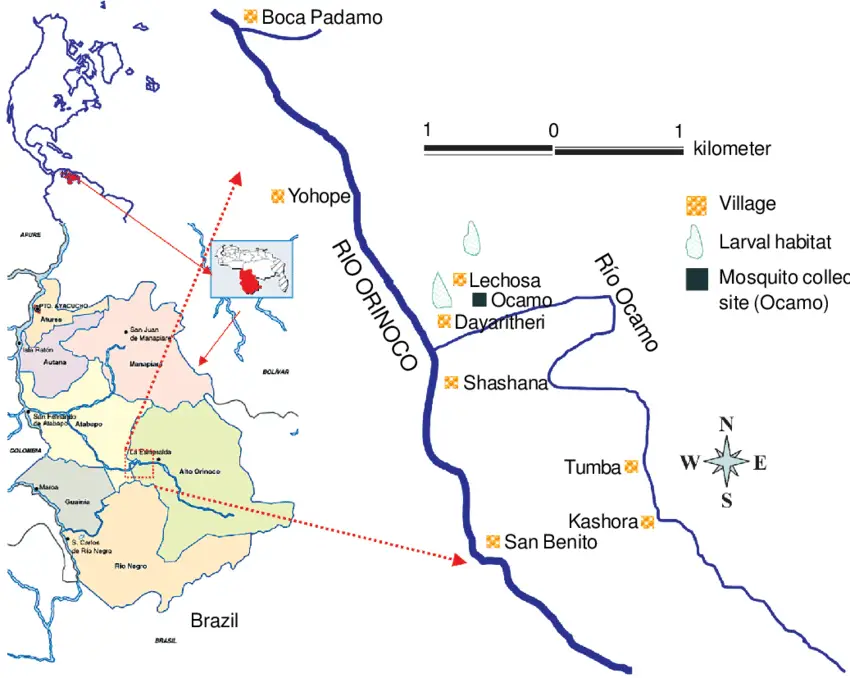 Tras hacer una búsqueda en la web, el equipo de Cazadores de Fake News halló un mapa del Alto Orinoco perteneciente a un estudio epidemiológico y entomológico de la dinámica de transmisión de la malaria en la zona, donde resalta el sector Santa María de las Guaicas, cercanos al lugar en el que se encuentra la instalación ovalada de techo rojo.