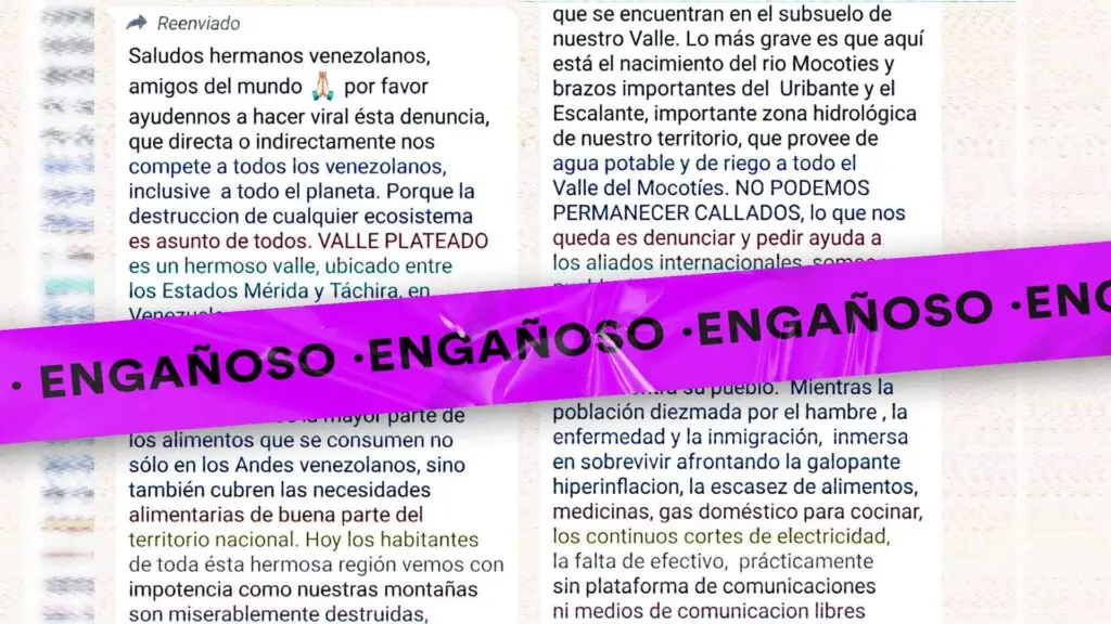 Sigue difundiéndose en 2023 un mensaje en cadena a través de los servicios de mensajería instantánea que indica que se estaría produciendo un crimen ambiental en la zona de Valle Plateado, entre los estados Mérida y Táchira, por la supuesta explotación de minas de coltán y plata.