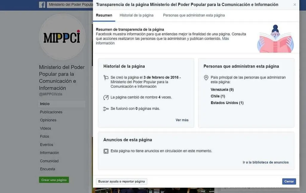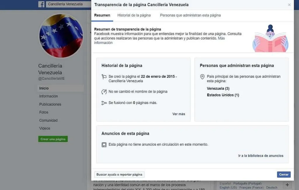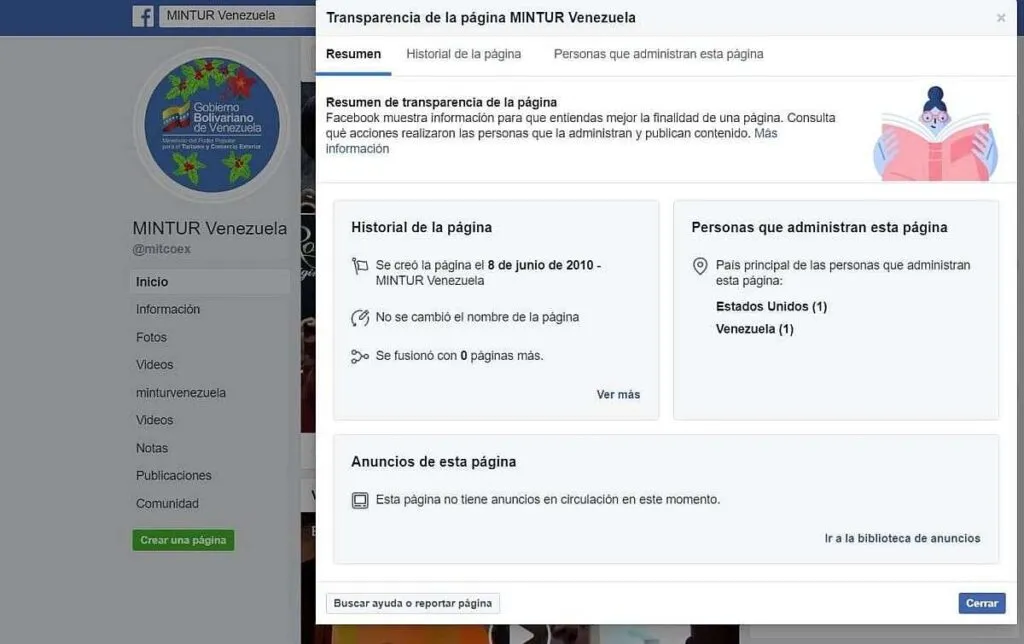 De hecho, las páginas de Facebook de Cancillería Venezuela, el MIPPCI y MINTUR, también muestran administradores cuyo «país principal» son los Estados Unidos.