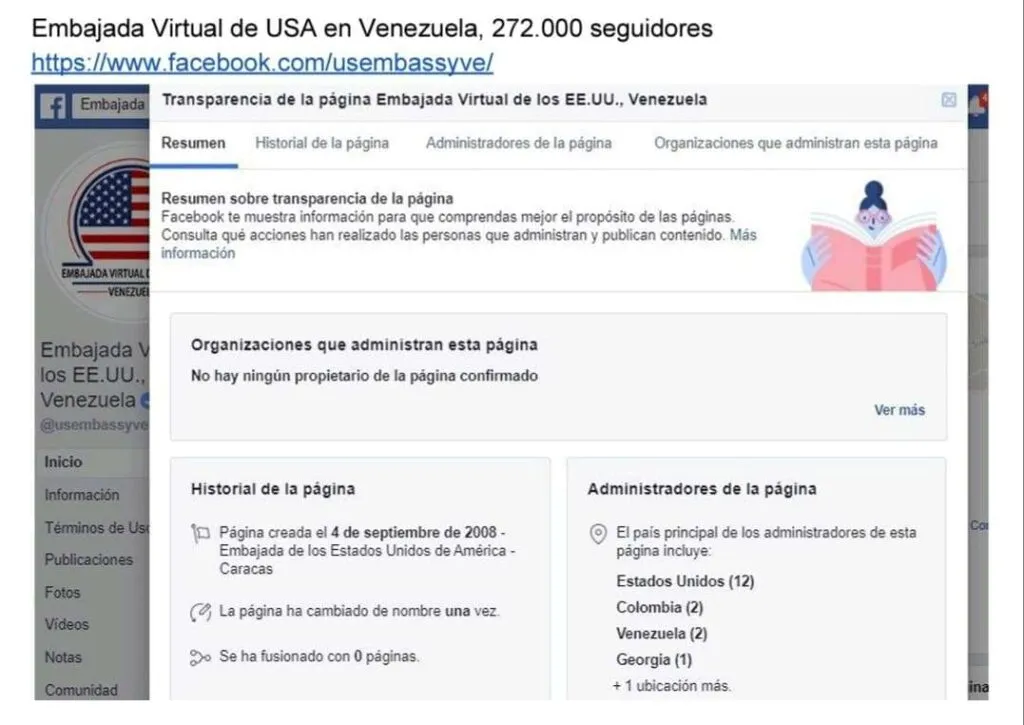 Un hilo escrito el 2 de enero de 2020 en la cuenta de Twitter de un militante del partido Podemos (España), ha señalado mediante el uso de pruebas engañosas que las principales páginas de Facebook que apoyan a Juan Guaidó, Presidente (E) de Venezuela, están administradas desde los Estados Unidos.
