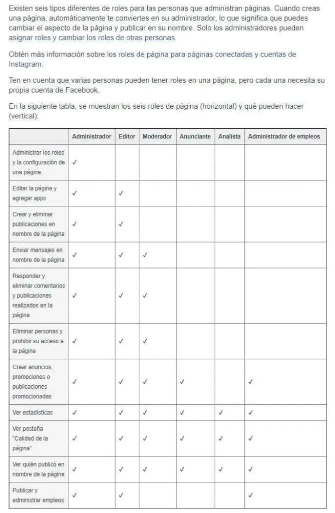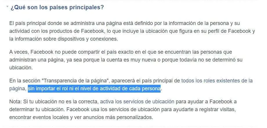 Adicionalmente, Facebook explica que el «país principal» se muestra para cada administrador de la página, indistintamente de su rol. Define «rol» así: