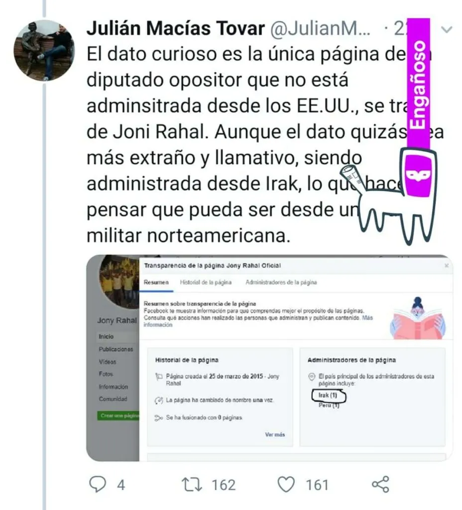Por último, se hace referencia a la página en Facebook del diputado Jony Rahal: «es administrada desde Irak, lo que hace pensar que pueda ser desde una base militar norteamericana«:
