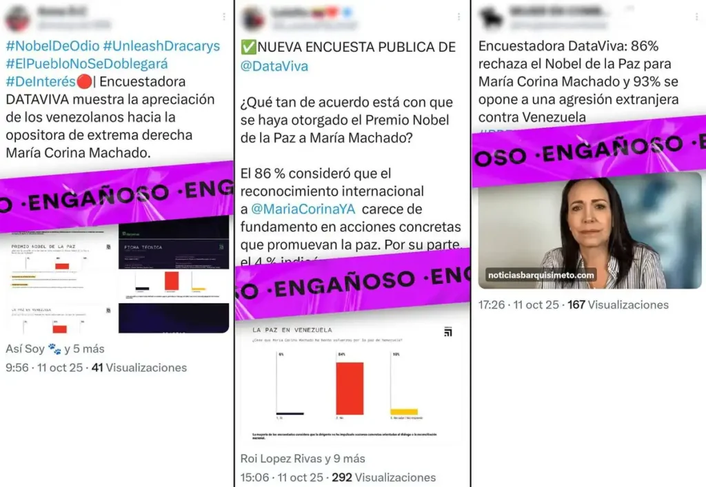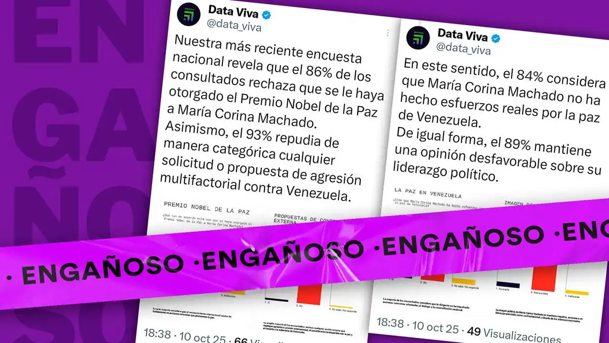 Cuentas en redes sociales y portales web afines al gobierno de Nicolás Maduro han difundido y amplificado durante las últimas horas un sondeo de la firma Data Viva en el cual se afirma que 84% de los venezolanos está en desacuerdo con la entrega del Premio Nobel de la Paz a la dirigente político María Corina Machado este 10 de octubre.