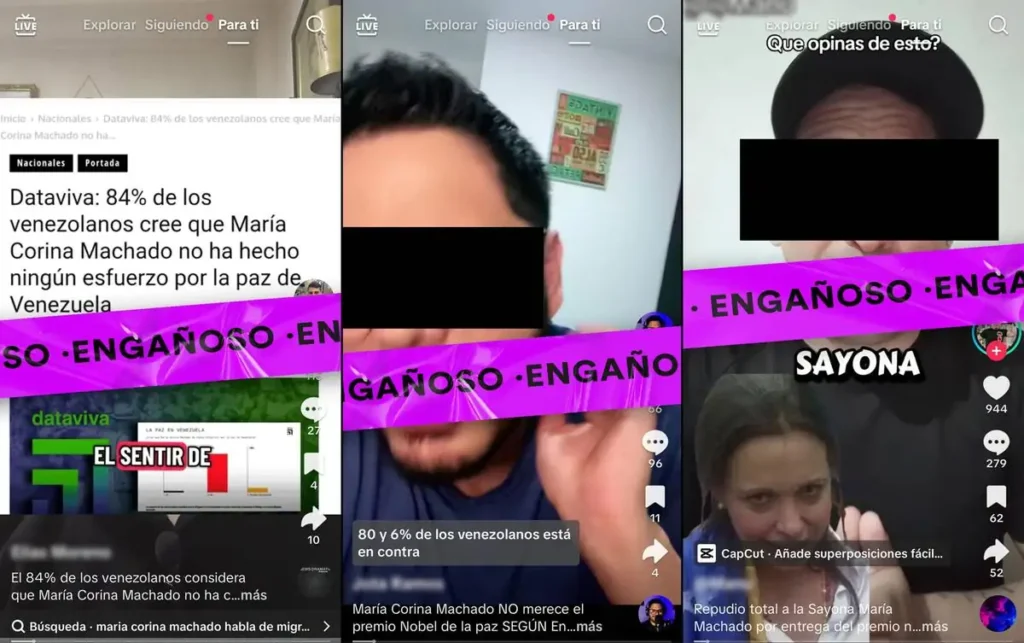 A diferencia de Instagram y X, la difusión y amplificación de la encuesta en TikTok fue realizada con videos presentados por personas que muestran su rostro y afirman que la encuesta ratifica el supuesto repudio y rechazo a quienes promueven acciones de fuerza para la salida del gobierno venezolano del poder.