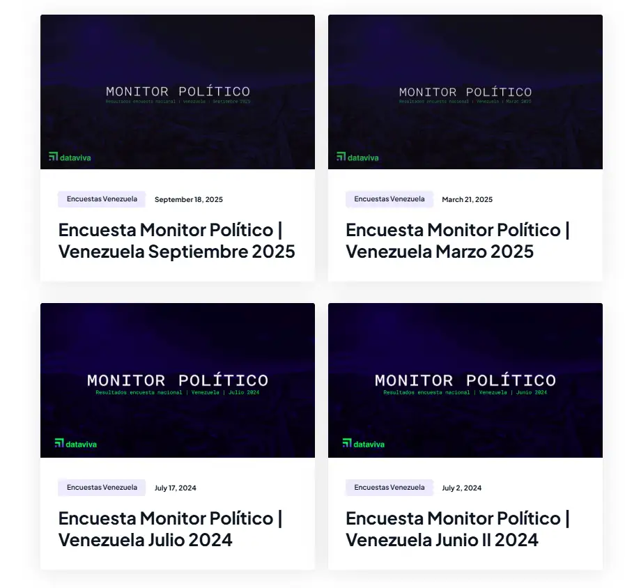 Previo a estas encuestas de 2025, no hay ninguna otra encuesta de Data Viva entre marzo de ese año y julio de 2024, cuando la pseudo encuesta publicó, a propósito de las elecciones presidenciales, que Nicolás Maduro y el Partido Socialista Unido de Venezuela (PSUV) contaban con un apoyo electoral de 55% y 51%, respectivamente.