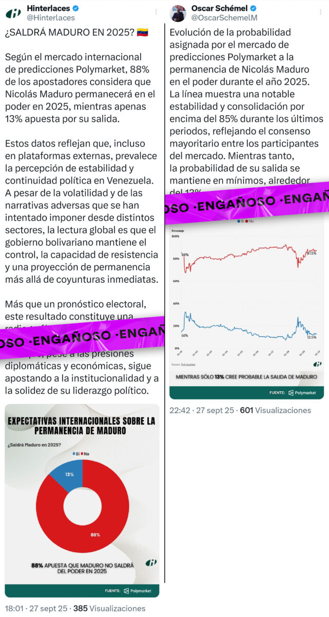 Además de su encuesta, Hinterlaces y su director, Oscar Schémel, también han compartido los resultados de la plataforma Polymarket, la cual arroja que 88% de las apuestas registradas son a favor de que Maduro seguirá en el poder en lo que resta del año 2025. Al calificarla como un “mercado internacional de predicciones”, se busca presentar a Polymarket como una fuente legítima de sondeos de opinión, cuando en realidad es una casa de apuestas en línea basadas en eventos reales y no en deporte que, por su naturaleza, han terminado en predicciones o amplios volúmenes de apuestas a resultados fallidos.