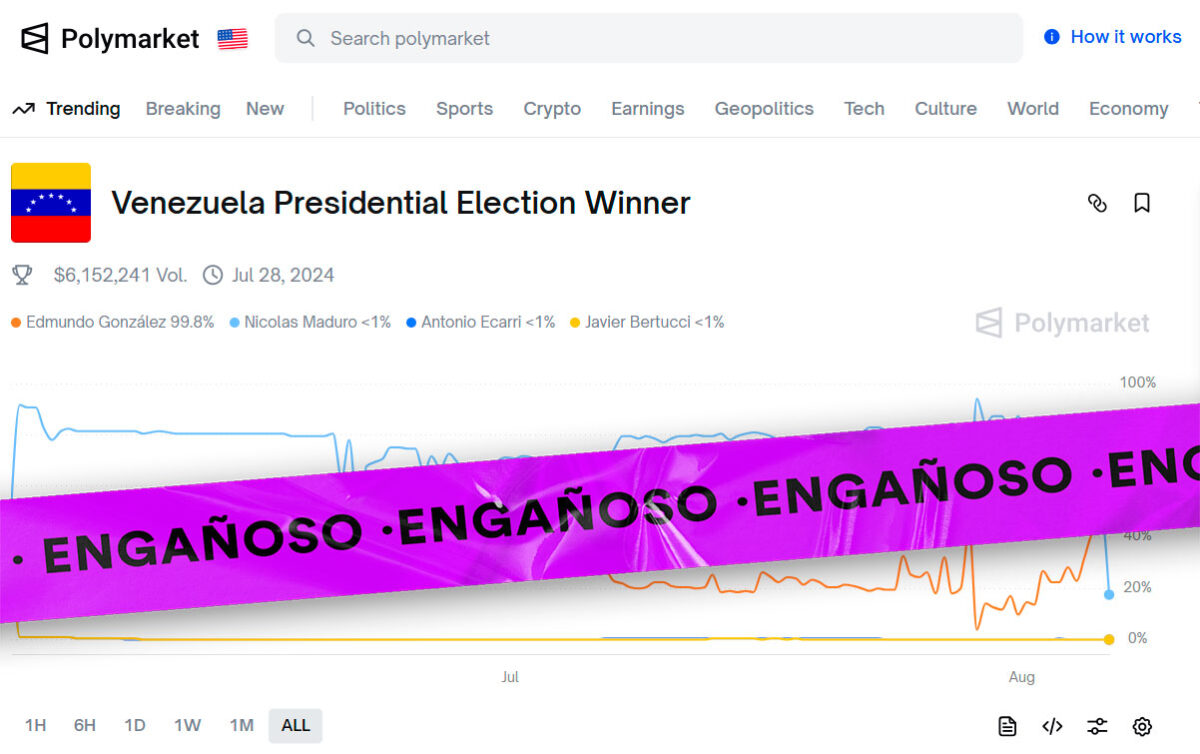 También en junio de 2024, algunos portales reseñaron las apuestas en Polymarket, que se inclinaban a favor de Maduro con un 82% de probabilidades de ganar las elecciones presidenciales del 28 de julio de ese año, como un reconocimiento. Pese a ello, en esta página también hay otras apuestas, desfavorables a Maduro, que no fueron impulsadas en el contexto venezolano, como “Venezuela Presidential Election Winner” en la que el 99,80% de los apostadores dio como ganador a Edmundo González Urrutia, mientras que Nicolás Maduro obtuvo menos del 1% de las apuestas.