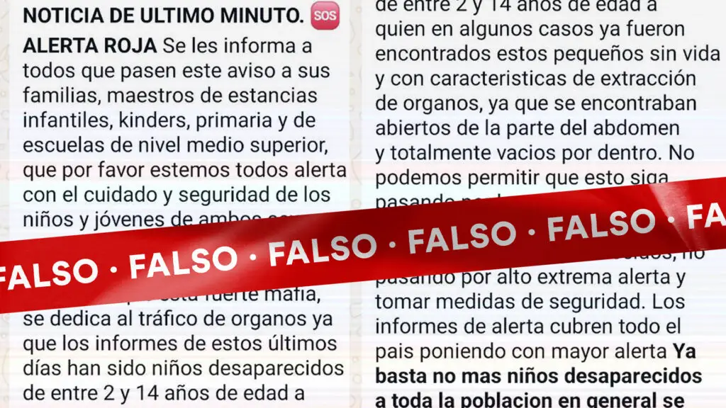 Es falso el mensaje que circula por WhatsApp que alerta sobre la presencia de una “poderosa mafia” que secuestra menores de edad y trafica órganos. La cadena ha sido difundida desde 2019 en varios países de la región y ha sido desmentida por las autoridades en cada momento.