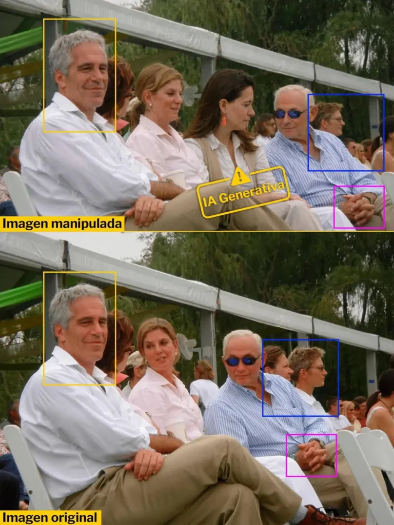 Al comparar la imagen falsa con la fotografía original, se identifican las alteraciones digitales como la eliminación del espaldar de una silla, el cambio de posición de personas e inconsistencias en la iluminación.