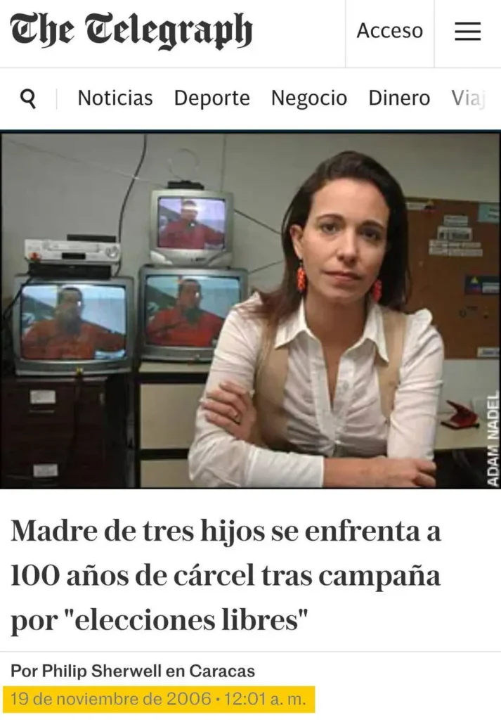 Asimismo, existe una alta probabilidad de que la fotografía utilizada para insertar a María Corina Machado en el montaje haya sido una imagen publicada por el diario británico The Telegraph en 2006, en la cual Machado aparece con exactamente los mismos elementos visuales que se observan en la falsificación: los zarcillos anaranjados, la blusa blanca y el chaleco beige.