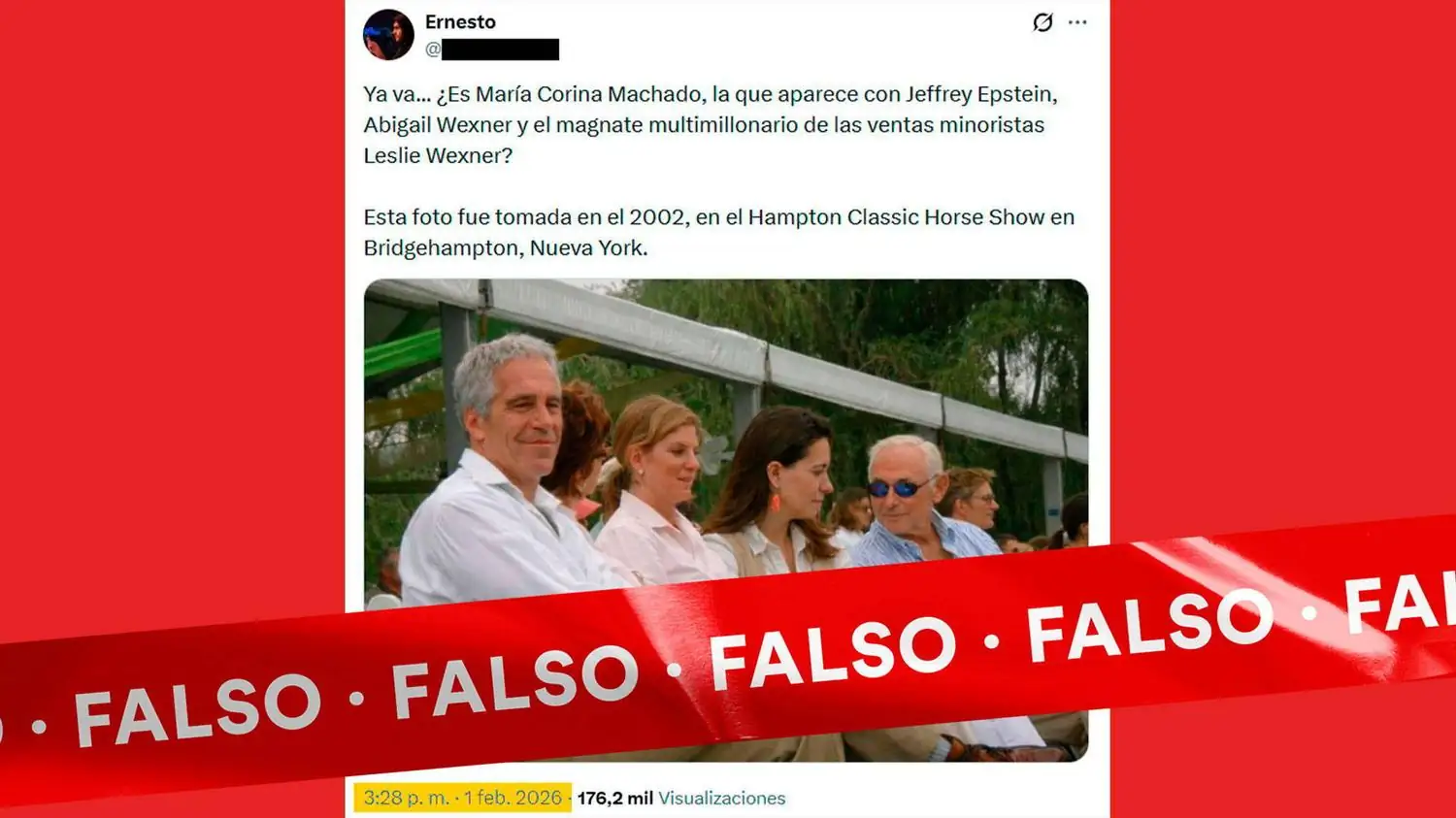 En redes sociales una imagen que supuestamente muestra a la líder opositora venezolana María Corina Machado sentada junto a Jeffrey Epstein y el magnate Leslie Wexner con su esposa Abigail Wexner. La fotografía, que habría sido tomada en 2002 durante el Hampton Classic Horse Show en Bridgehampton, Nueva York.