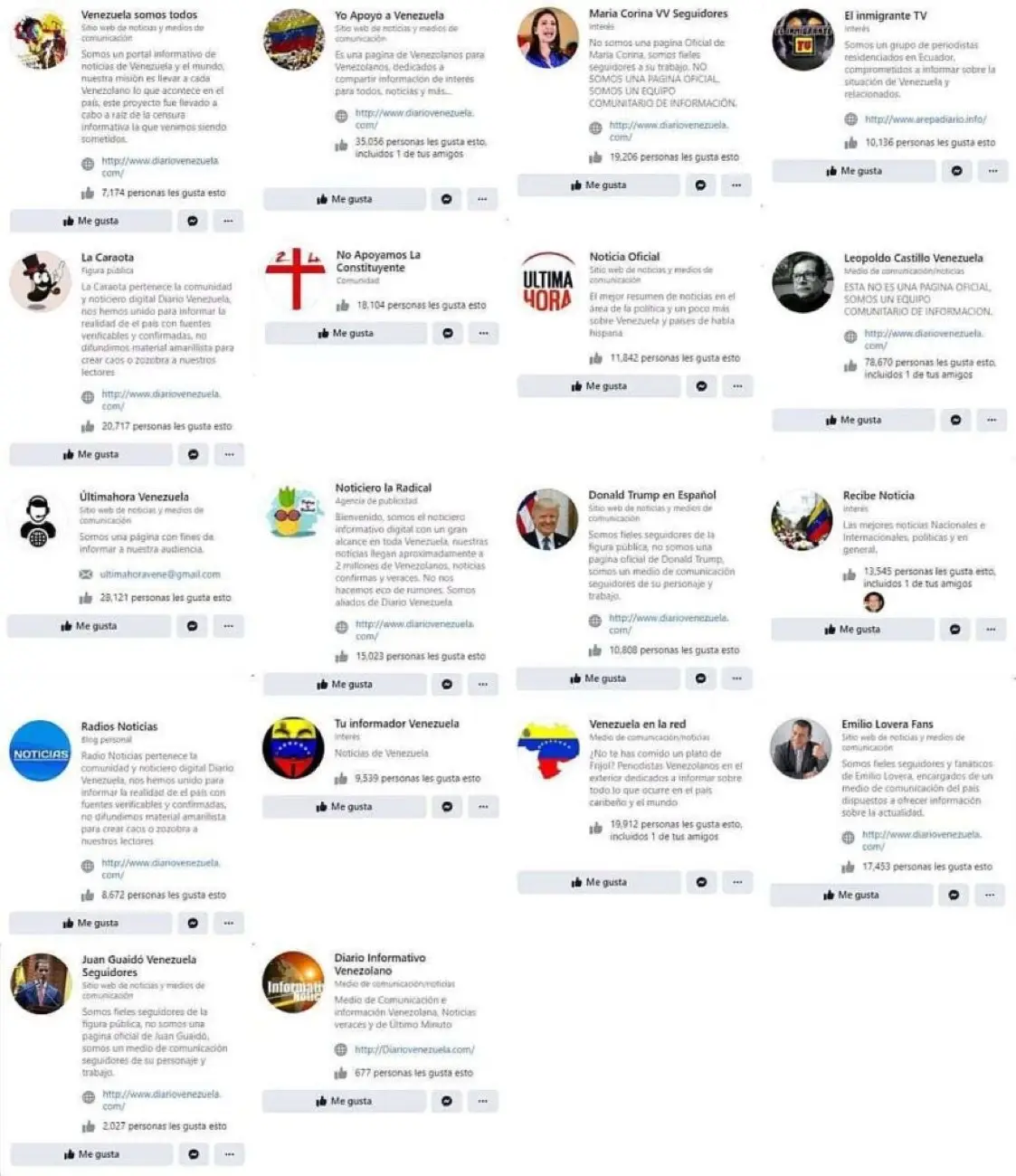 Cada una de las 18 páginas de Facebook que forman parte de esta red, se describen como páginas no oficiales o creadas por seguidores de figuras públicas, políticos y artistas (la ya mencionada «Leopoldo Castillo Venezuela» cuya captura se hizo viral, «María Corina VV Seguidores«, «Emilio Lovera Fans» o «Juan Guaidó Venezuela Seguidores«) o como comunidades de periodistas o portales informativos de noticias de Venezuela («Venezuela somos todos«, «Noticia Oficial«, «Recibe Noticias«, «Últimahora Venezuela«, «Noticiero la Radical» o «Diario Informativo Venezolano«).