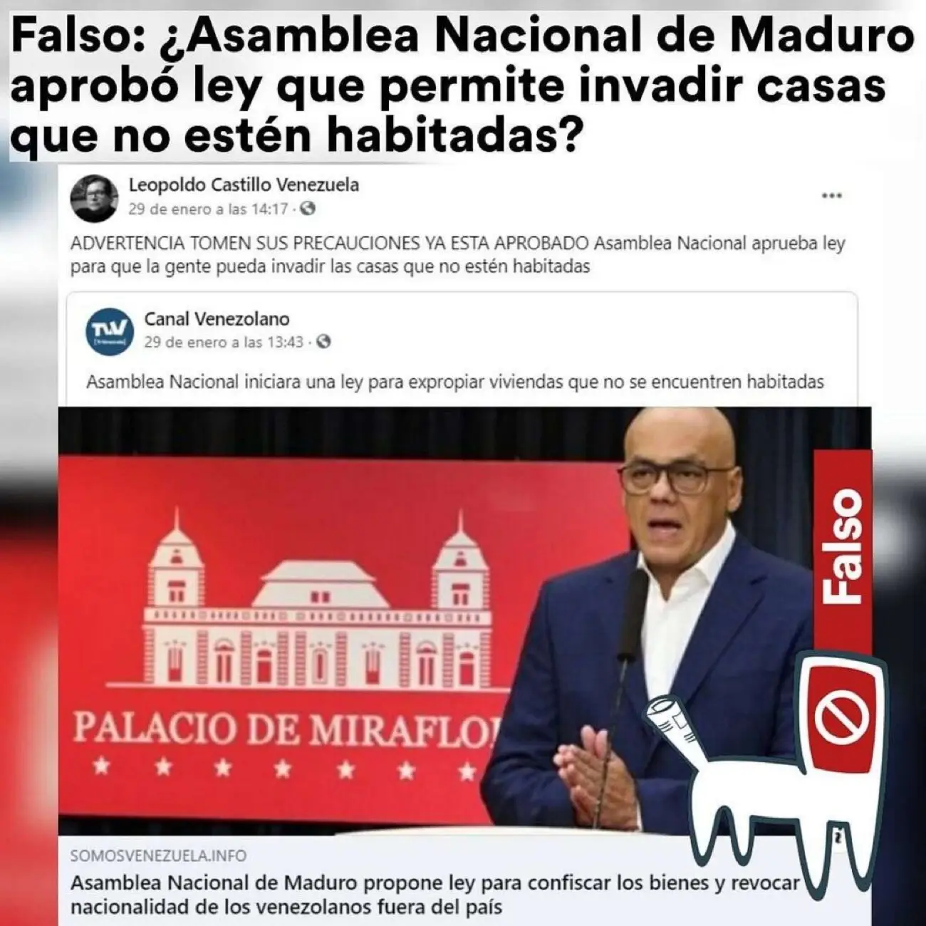 El título del artículo publicado en la página somosvenezuela.info, «Asamblea Nacional de Maduro propone ley para confiscar los bienes y revocar la nacionalidad de los venezolanos fuera del país», es FALSO. Hasta la fecha de publicación de esta nota, no ha ocurrido ni la promulgación de una nueva ley, ni ninguna discusión en plenaria sobre el tema.