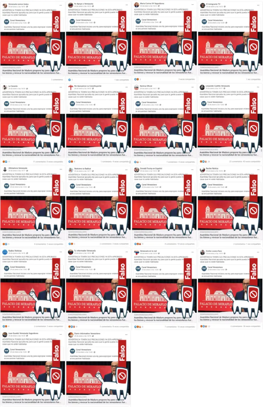 El enlace al bulo publicado por el portal somosvenezuela.info, fue compartido por la página de Facebook «Canal Venezolano» el 29 de enero de 2021 a las 12:43 am. (VEN). 32 minutos después, la publicación de «Canal Venezolano» fue compartida de forma casi simultánea por otras 18 páginas de Facebook distintas, que agregaron exactamente el mismo texto en cada nueva publicación: «ADVERTENCIA TOMEN SUS PRECAUCIONES YA ESTA APROBADO / Asamblea Nacional aprueba ley para que la gente pueda invadir casas que no no estén habitadas«. Todas las publicaciones fueron compartidas en un intervalo de 4 minutos: entre las 1:15 pm y las 1:19 pm (VEN) del 29 de enero de 2021.