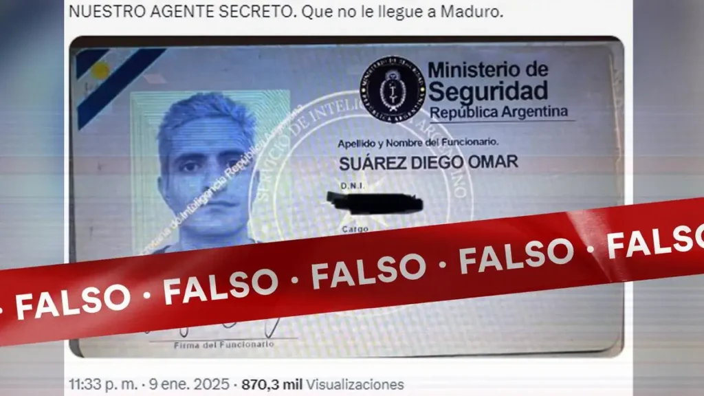 Una búsqueda en Internet permitió determinar que la imagen utilizada como base para este montaje corresponde a una identificación falsa decomisada en un caso policial de 2019. Comparando ambas imágenes se observó que el carnet utilizado como «prueba» comparte características con documentos incautados en un operativo realizado en 2019, cuando un hombre fue arrestado en Argentina por hacerse pasar por un agente de inteligencia.