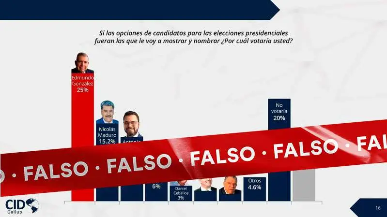 El pasado 11 de mayo, se compartió en X y en Instagram una lámina con resultados de un supuesto estudio de la firma CID Gallup, una consultora con sede en nueve países de la región, referente a la intención de voto para la elección presidencial pautada para el 28 de julio.