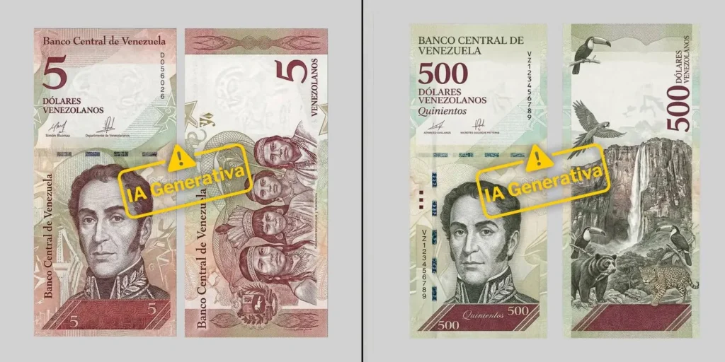 En redes sociales, especialmente en TikTok, circula un video en el que un usuario muestra unos billetes de denominaciones 5 y 10 con el membrete «Banco Central de Venezuela» y la inscripción «dólares venezolanos». Los billetes presentan en su cara frontal el rostro de Simón Bolívar y en el reverso el escudo nacional junto a un grupo de indígenas. En la grabación, el usuario afirma: «acaban de llegar los dólares venezolanos, no es IA como muchos dicen».