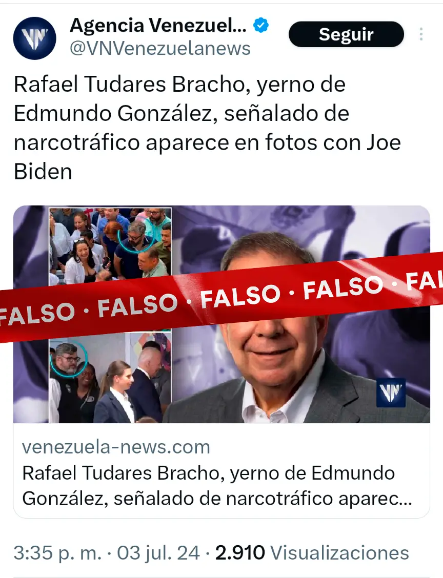 Actualización al 06/07/2024 12:04: Se agregó la información relativa a un nuevo bulo sobre Tudares Bracho en el que se le ubica en una supuesta fotografía con Joe Biden.