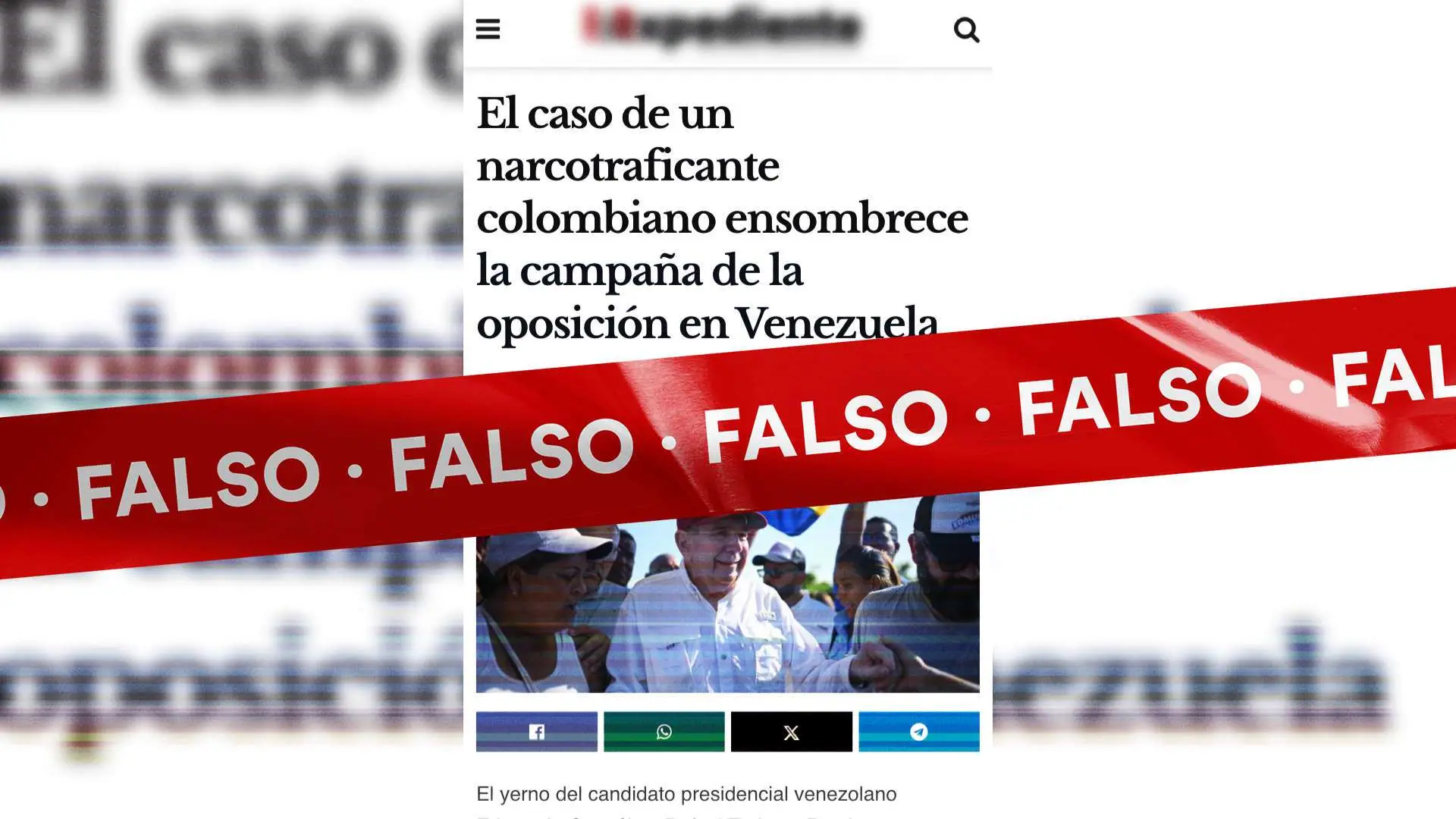 Circula en redes sociales la noticia de un supuesto narcotraficante colombiano que tendría vínculos con el yerno del candidato opositor Edmundo González Urrutia. El artículo fue publicado originalmente en el portal colombiano “El Expediente” y está siendo compartido por portales y perfiles en redes sociales que difunden desinformación regularmente, cercanos al gobierno de Nicolás Maduro.
