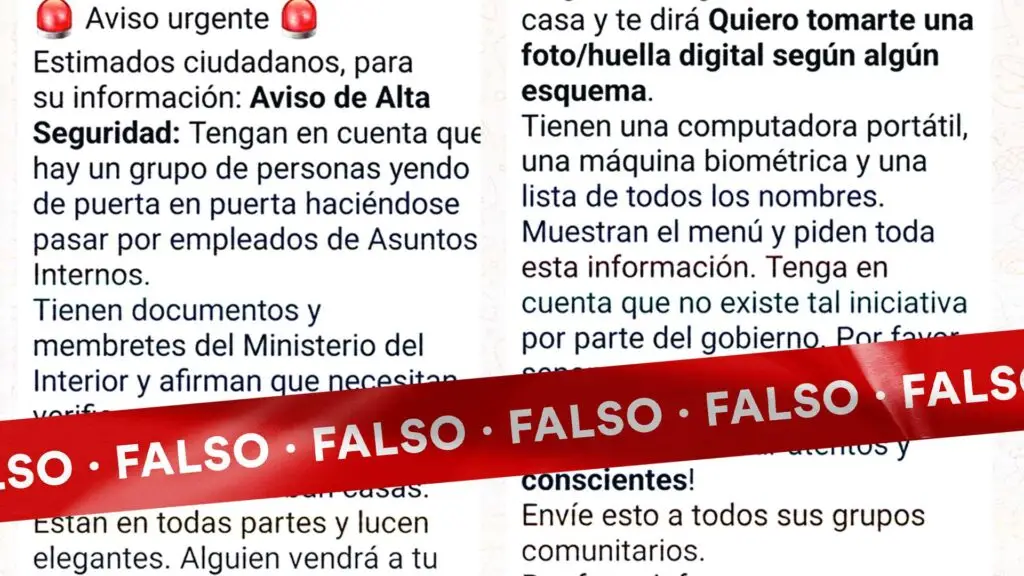 En las últimas semanas se está difundiendo un mensaje en cadena a través de los servicios de mensajería instantánea y redes sociales donde se alerta que supuestos funcionarios de asuntos internos del Ministerio de Interior, están yendo a las casas para confirmar informaciones personales para el próximo censo como excusa para después robar en las viviendas.