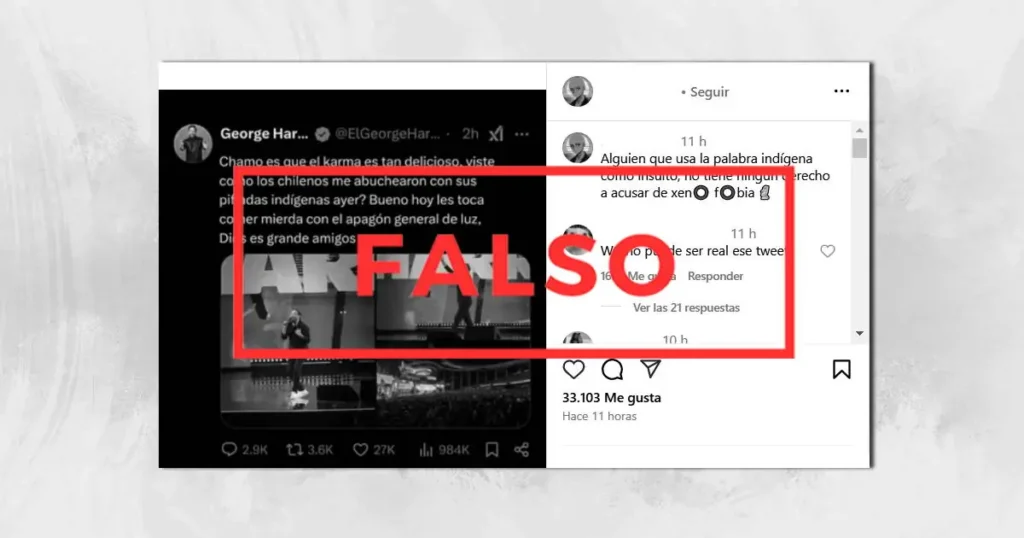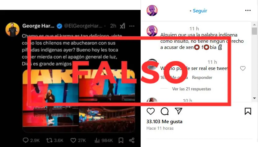 Por lo tanto, calificamos como falso que George Harris se burló del apagón en Chile. En realidad, la fotografía que circula en redes es un montaje realizado a partir del post del humorista tras bajar del escenario del Festival de Viña.