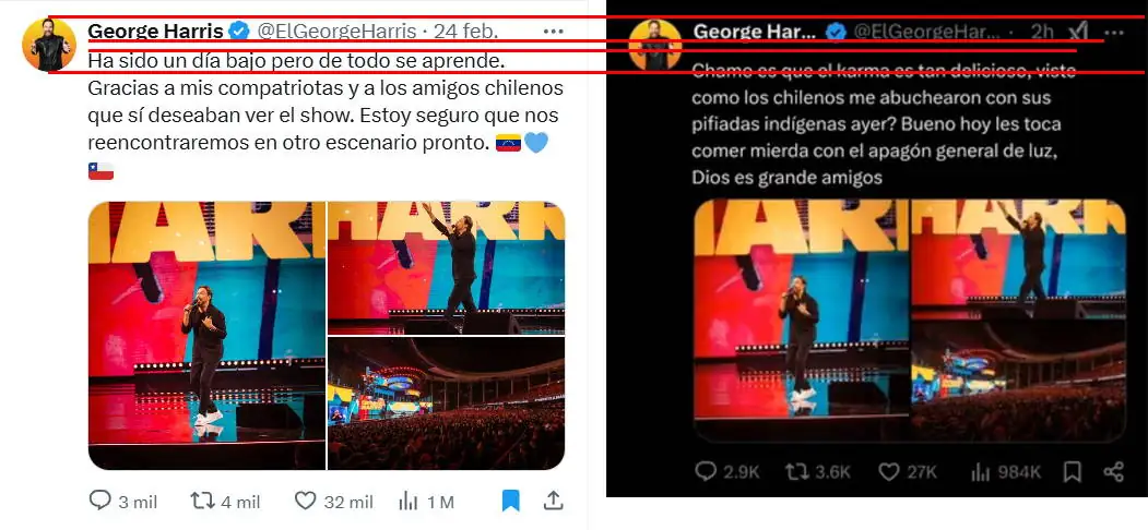 Desde su polémica presentación en el Festival de Viña del Mar, George Harris ha sido uno de los personajes más comentados en redes. El humorista fue pifiado por el ‘monstruo’ de la Quinta a menos de 15 minutos sobre el escenario y terminó por bajarse tras casi una hora de rutina. Sin embargo, su nombre volvió a viralizarse a propósito del corte de energía a nivel nacional de este martes. Según los posteos, George Harris se burló de las personas afectadas por el apagón en Chile.