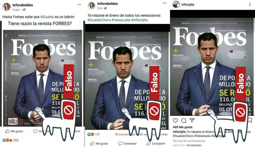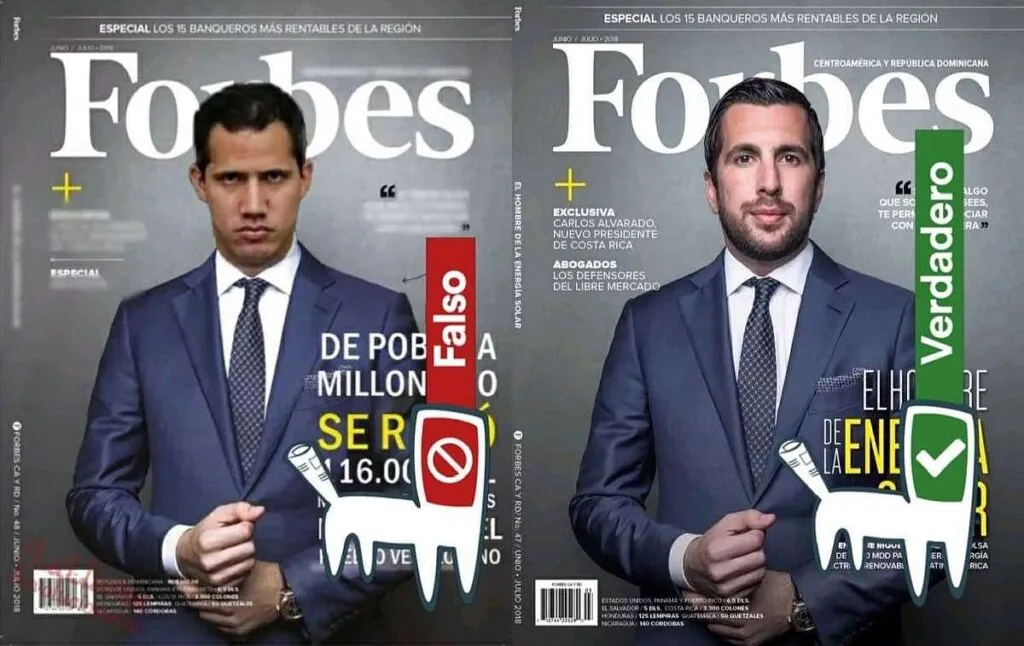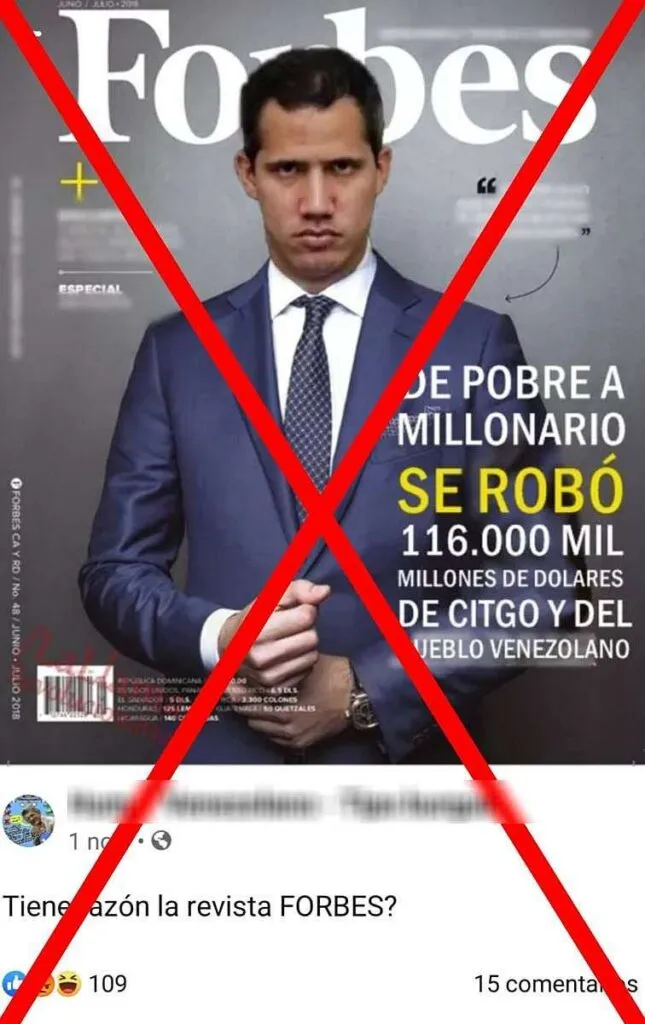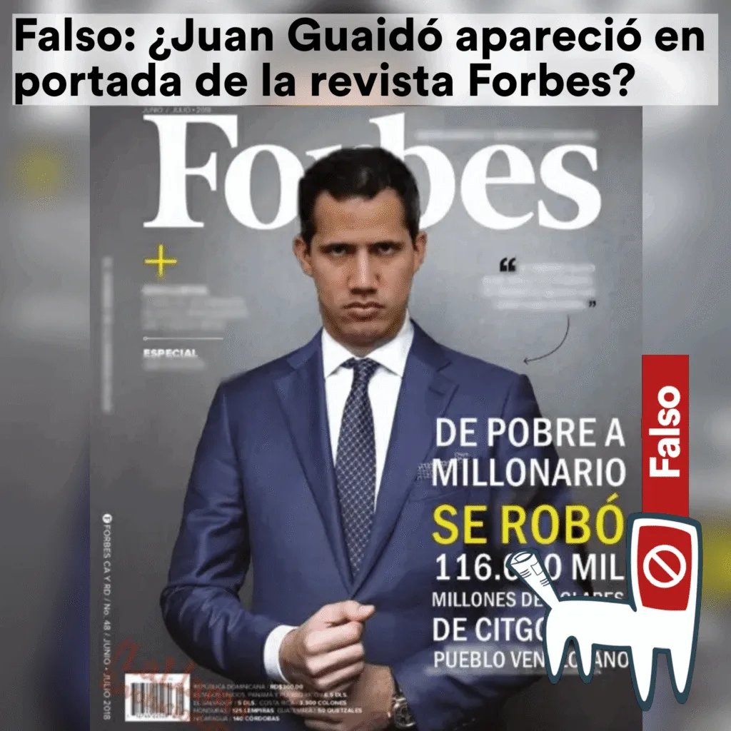Se está difundiendo a través de Facebook y WhatsApp la imagen de una supuesta portada de la revista Forbes, con la fotografía del presidente interino Juan Guaidó en portada y la leyenda «de pobre a millonario, se robó 116.000 millones de dólares de CITGO y del pueblo venezolano».