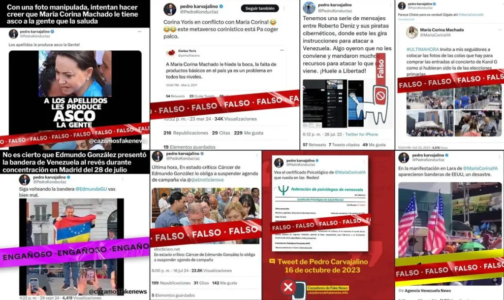 Ambas imágenes fueron compartidas por Pedro Carvajalino, un comunicador pro-oficialista con un largo historial en la difusión de desinformación que ha promovido decenas de bulos como publicaciones y conversaciones falsificadas, imágenes manipuladas y otros actos desinformativos que han sido desmentidos por Cazadores.