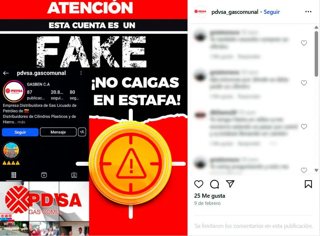 El presidente de Pdvsa Gas Comunal, Julio Enrique Rojas, informó el pasado mes de febrero que la cuenta de Instagram usada para vender este falso servicio y sus administradores son investigados por estafa