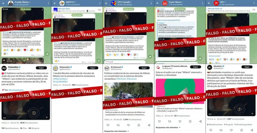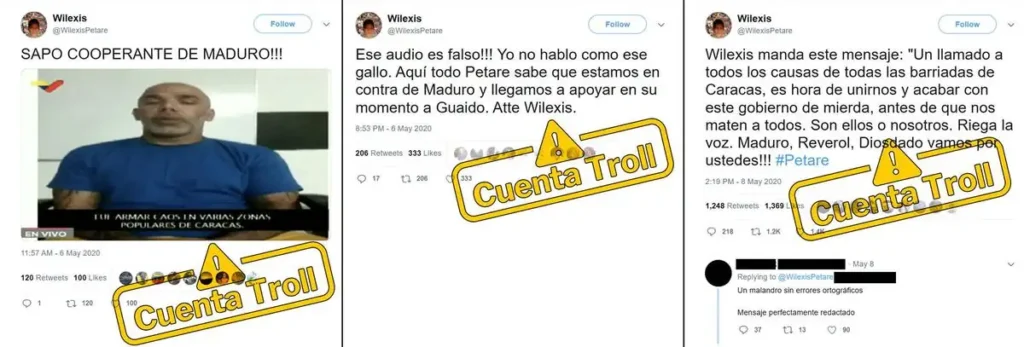 La investigación de Cazadores de Fake News confirmó que el audio es falso y proviene de una cuenta troll en Twitter/X que antes operaba con el nombre de usuario @wilexispetare. Esta cuenta, creada en mayo de 2020, fue parte de una campaña de desinformación vinculada a la Operación Gedeón y a los enfrentamientos ocurridos a inicios de ese mes en Petare, donde la banda de Wilexis se enfrentó a grupos rivales y a cuerpos de seguridad durante un operativo policial.