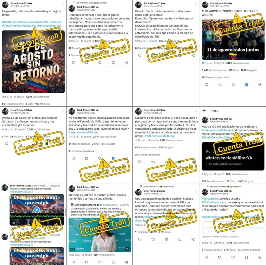 Al mismo tiempo, @ErickPrinceSOS difunde mensajes para generar discordia contra figuras de la oposición como María Corina Machado y Edmundo González Urrutia. Además, ataca las movilizaciones pacíficas, promueve convocatorias a protestas violentas o «sin retorno», exige intervención militar extranjera y cuestiona el destino de las donaciones recibidas por Ya Casi Venezuela. Un patrón que ya se ha observado en el pasado.