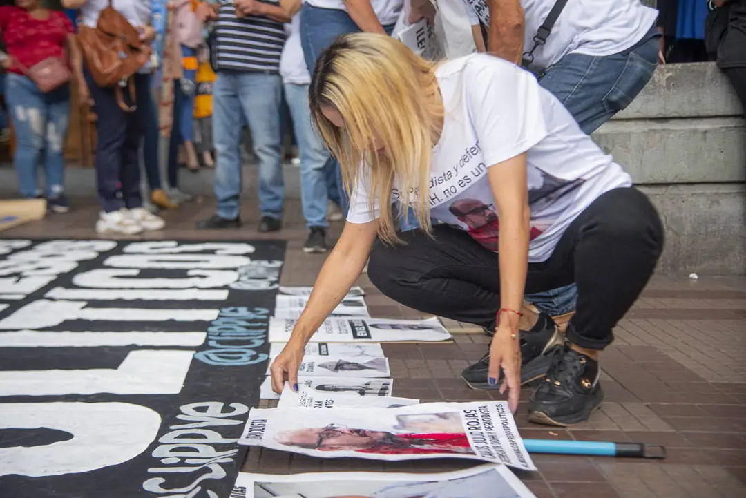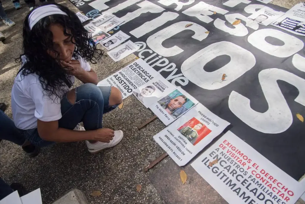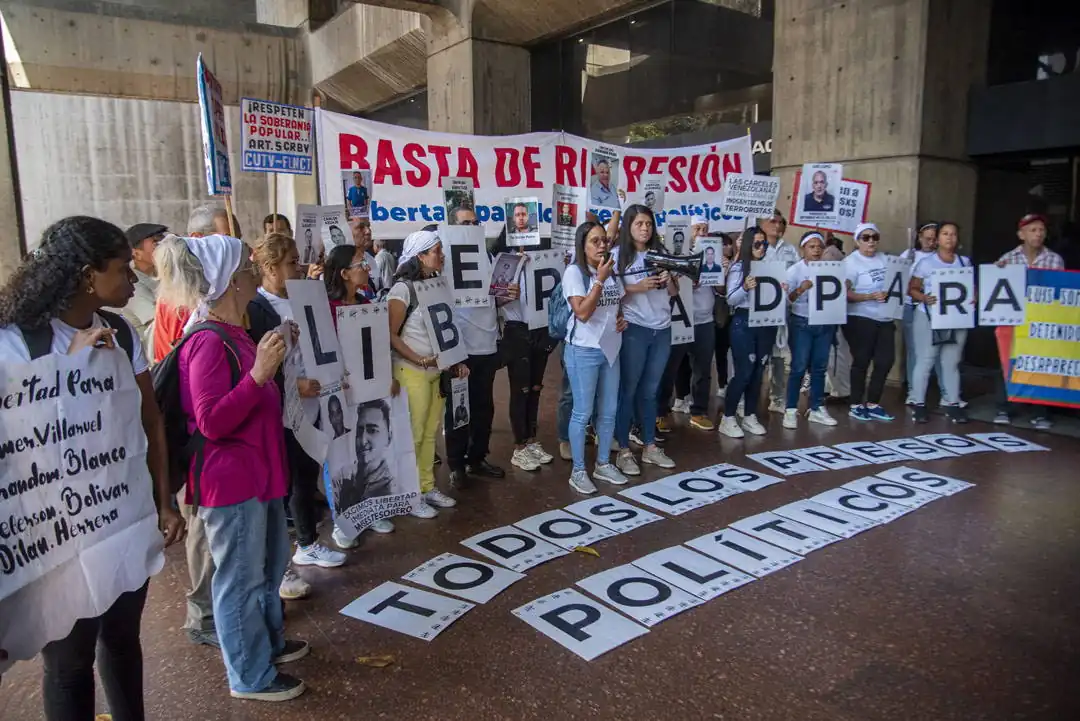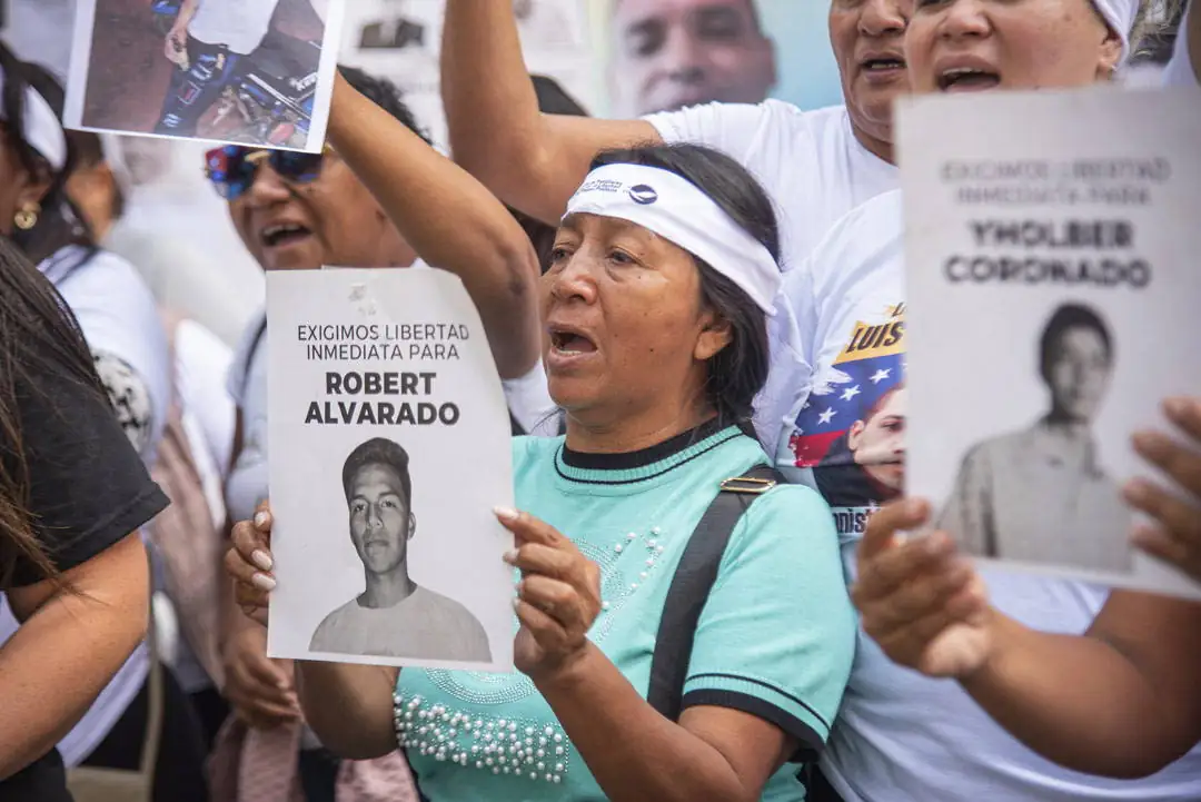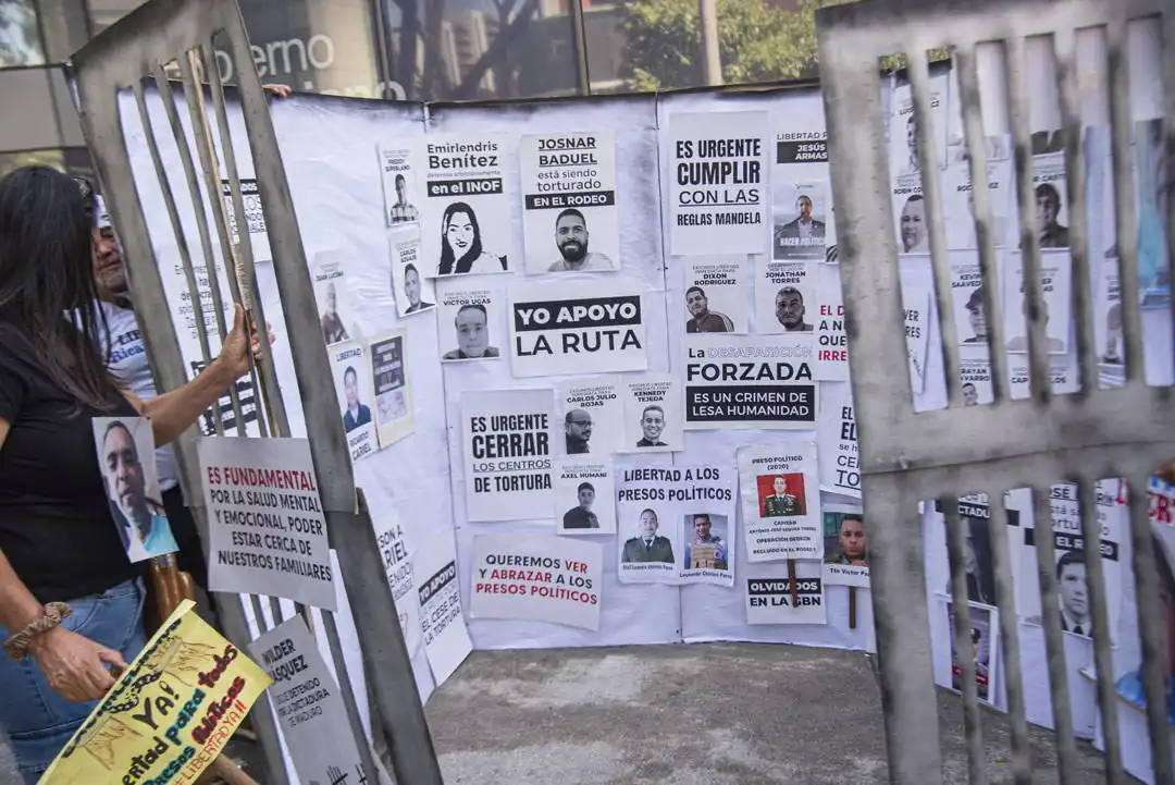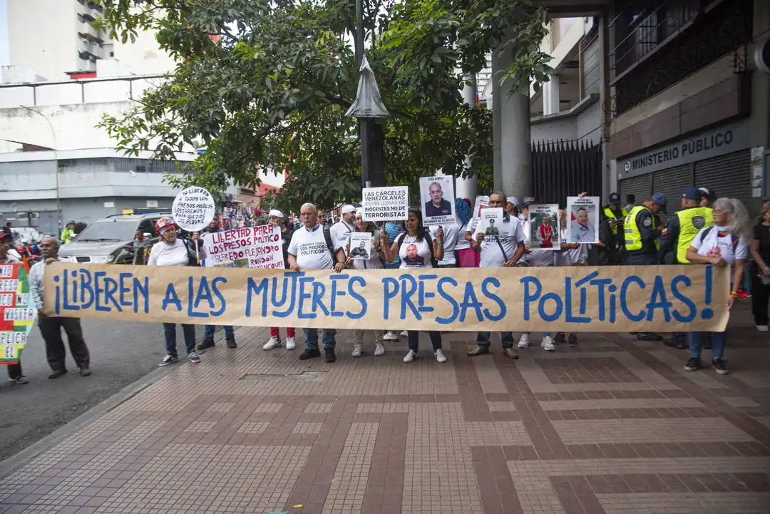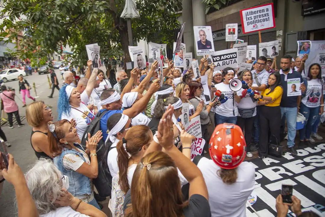 Alzan carteles y muestran sus franelas con fotos de sus familiares presos. La mayoría son mujeres: madres, hermanas, esposas, primas. Cuando alguna ofrece una declaración a los periodistas que han llegado a cubrir la actividad, estiran más los brazos: se aseguran de que se puedan ver bien los retratos. Que aparezcan. Que no queden ocultos. De eso se trata esto.