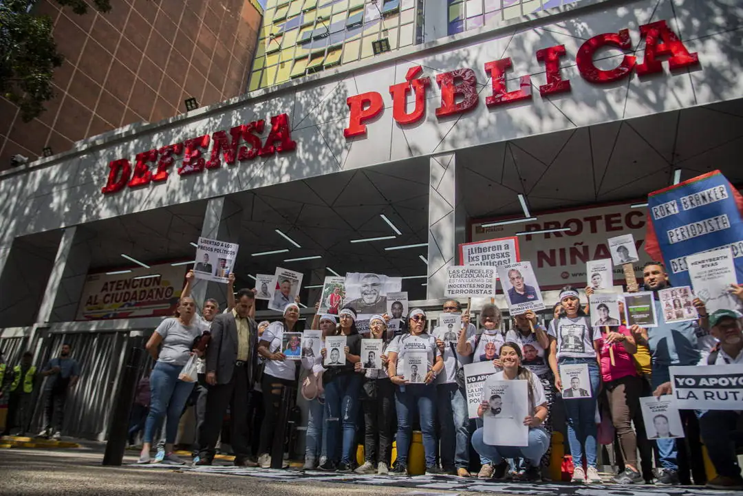 Son mujeres. Casi siempre quienes persiguen la justicia para los suyos son mujeres. Pero también hay hombres: algunos padres, amigos, hermanos. Ahí están, faltando pocos minutos para las 10:00 de la mañana, frente a la Defensa Pública, a un costado de ese bulevar arbolado del centro de Caracas que conduce hacia el Panteón Nacional. Se saludan con un abrazo, se sonríen entre sí. En el suelo, frente al edificio, estiran la pancarta larga que también agitaron ayer y sacan las fotos de sus familiares presos.