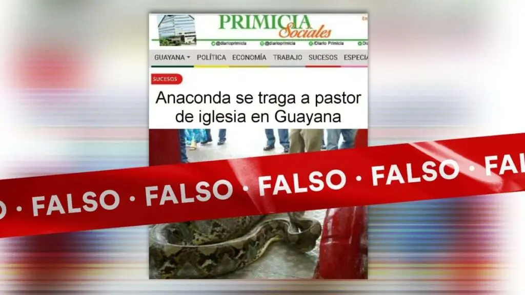 Circula en Facebook la falsa imagen de un titular del diario Primicia que reseña que una anaconda se habría tragado al pastor de una iglesia en Guayana. La investigación de Cazadores de Fake News determinó que la imagen es un bulo que ha sido difundido en Internet, al menos, desde el 2013 y que fue descontextualizada por una página de Facebook que ha publicado desinformación en reiteradas ocasiones.