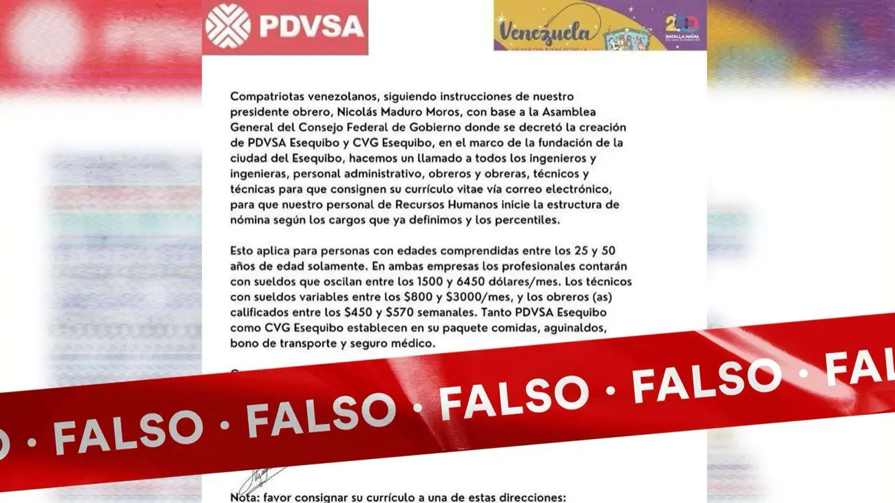 La información sobre la convocatoria para crear las nóminas de Pdvsa Esequibo y CVG Esequibo es falsa y fue desmentida directamente por Petróleos de Venezuela S. A.