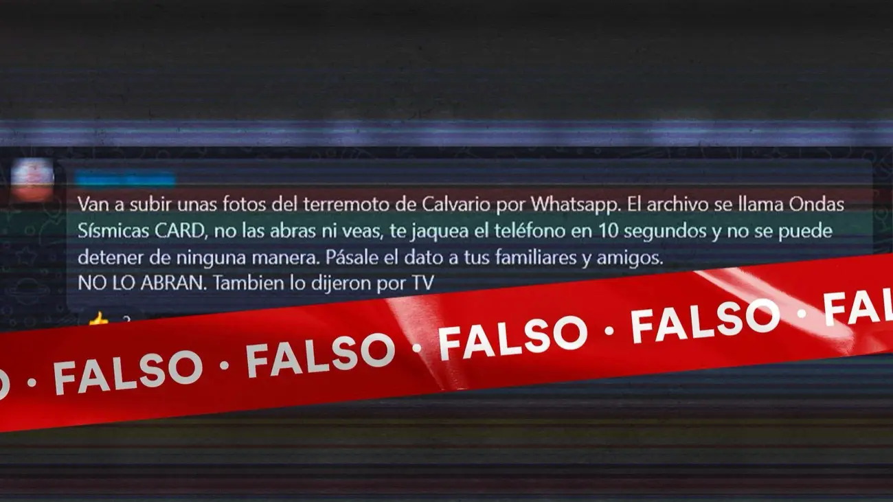 “Van a subir unas fotos del terremoto de Calvario por Whatsapp. El archivo se llama Ondas Sísmicas CARD, no las abras ni veas, te jaquea el teléfono en 10 segundos y no se puede detener de ninguna manera. Pásale el dato a tus familiares y amigos. NO LO ABRAN. Tambien lo dijeron por TV (sic.)”.