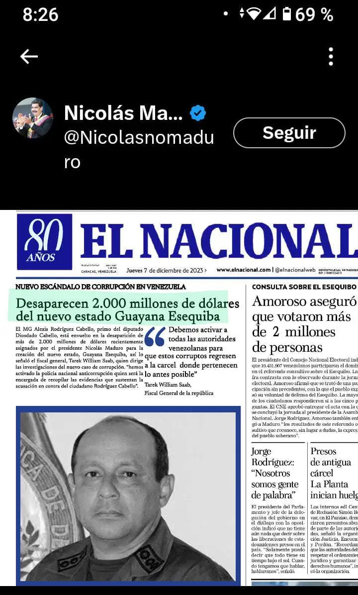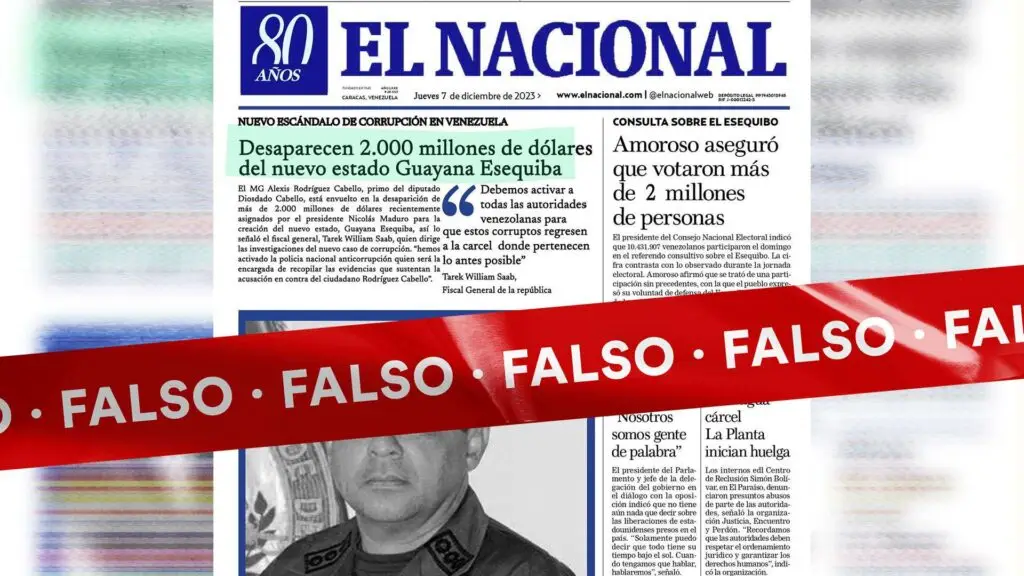 El Nacional no ha publicado ninguna denuncia sobre la desaparición de 2.000 millones de dólares del nuevo estado Guayana Esequiba ni sobre el anuncio de Elvis Amoroso de más de 2 millones de votantes en el referéndum sobre el Esequibo. La imagen que está circulando es una manipulación digital.