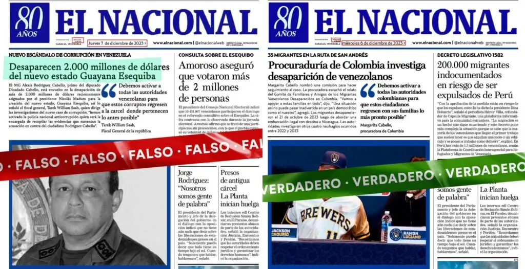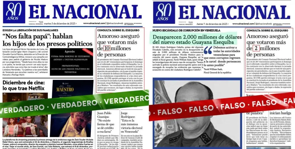 Está circulando en redes sociales y servicios de mensajería instantánea una imagen que simula ser la portada del diario El Nacional del 7 de diciembre de 2023, en la que resaltan los titulares “desaparecen 2.000 millones de dólares del nuevo estado Guayana Esequiba” y “Amoroso aseguró que votaron más de 2 millones de personas”.