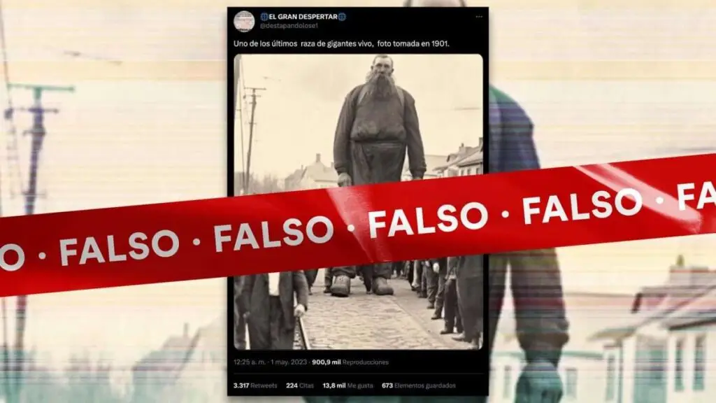 “Uno de los últimos raza de gigantes vivo, foto tomada en 1901” o “El último de los gigantes que pasa por las calles. Foto tomada alrededor de 1890” son algunos de los textos que acompañan la fotografía viral del hombre gigante en Twitter y Facebook, mientras que en Tiktok aparece en algunos videos explicativos de la supuesta civilización gigante de Tartaria.