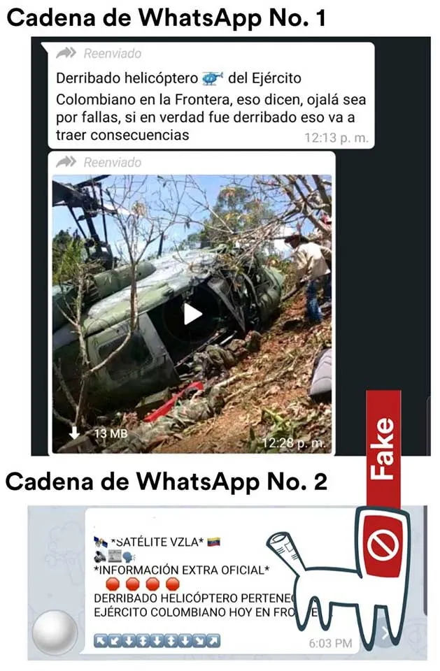 Se está difundiendo a través WhatsApp y Twitter una información sobre un supuesto helicóptero de la Fuerza Aérea Colombiana que ha sido derribado en la frontera entre Venezuela y Colombia. La información ha llegado al foro Cazadores de Fake News inicialmente como un enlace a un tuit y posteriormente en forma de dos cadenas de WhatsApp diferentes, una de las cuales fue difundida junto con un video de 13 Mb.