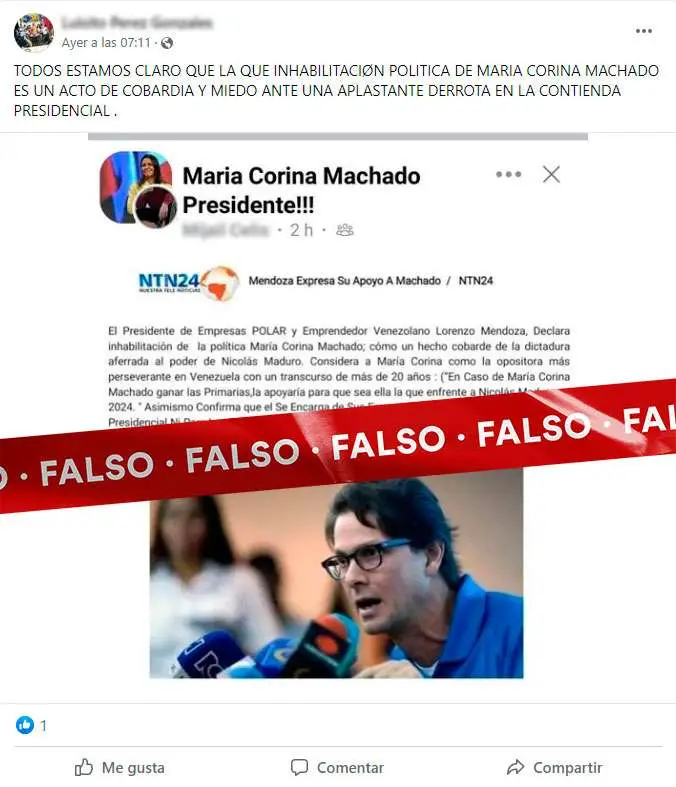Se está compartiendo en Facebook, Whatsapp y Twitter, una imagen que simula ser la captura de pantalla de una publicación de NTN24 en la que supuestamente Lorenzo Mendoza expresa su apoyo a María Corina Machado.
