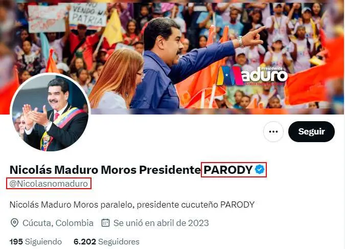 El nombre de usuario de la cuenta que emitió el tuit es @nicolasnomaduro, una cuenta suscrita a Twitter Blue con la marca de verificación azul que tiene todos los elementos de imagen de la cuenta real de Maduro, pero se identifica como “parodia” justo después del nombre completo lo que hace difícil identificar que es una cuenta falsa en la aplicación móvil de Twitter.