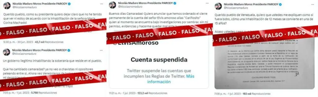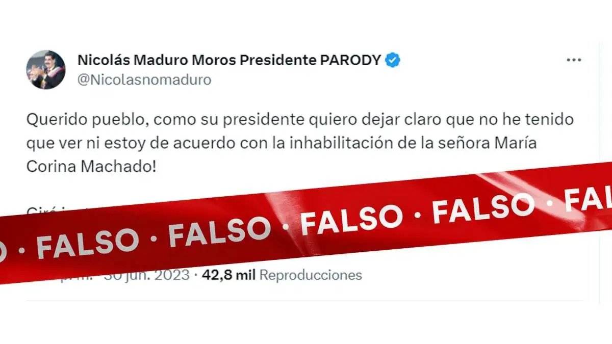 Respecto a la inhabilitación de María Corina Machado, la cuenta parodia ha hecho otras publicaciones que pueden engañar a la audiencia, por lo que exhortamos a nuestros lectores a verificar el nombre de usuario antes de retuitear o comentar cualquier tuit que parezca venir de Maduro.