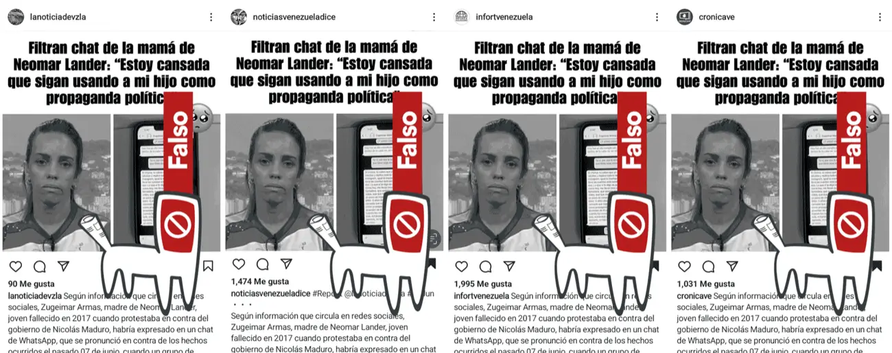 La información fue publicada y difundida en Instagram por una red de falsos noticieros, previamente identificada, identificada por Cazadores de Fake News con el nombre clave #LaFábrica de Desinformación.