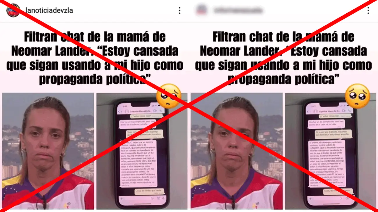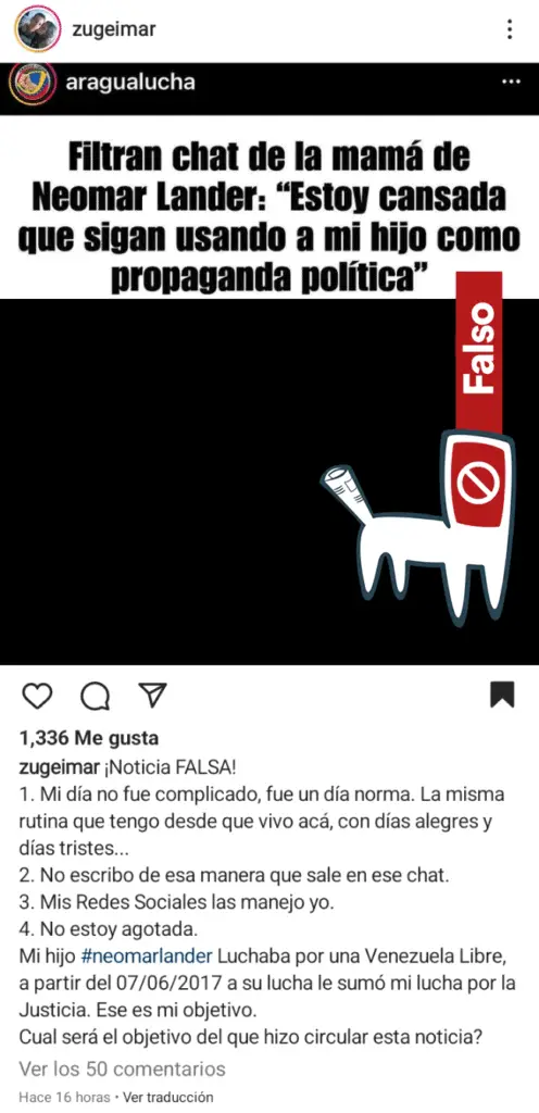 Circula en Instagram, Facebook y WhatsApp, la fotografía de una supuesta conversación de WhatsApp realizada entre una persona anónima y Zugeimar Armas, madre de Neomar Lander, joven manifestante venezolano asesinado durante las protestas en Venezuela de 2017.