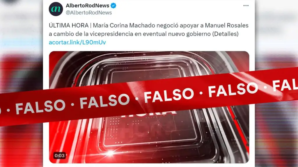 La información que señala que María Corina Machado negoció su apoyo a Manuel Rosales a cambio de la vicepresidencia en su eventual nuevo gobierno es falsa y resalta la necesidad de una rigurosa verificación de las noticias antes de su difusión.