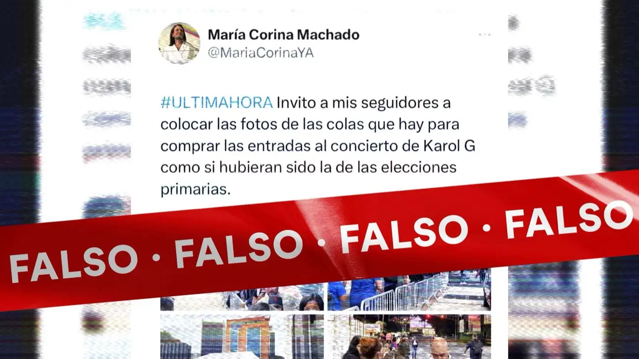 Cuentas desinformantes publicaron en Instagram y la red social X un post atribuido a la cuenta en X de María Corina Machado (@MariaCorinaYA) en el que –supuestamente– la candidata presidencial por la Plataforma Unitaria Democrática (PUD) pidió a sus seguidores publicar fotos de las colas que se hicieron en Caracas para comprar las entradas al concierto de la cantante colombiana Karol G, como si fueran fotos de las elecciones primarias del 22 de octubre.