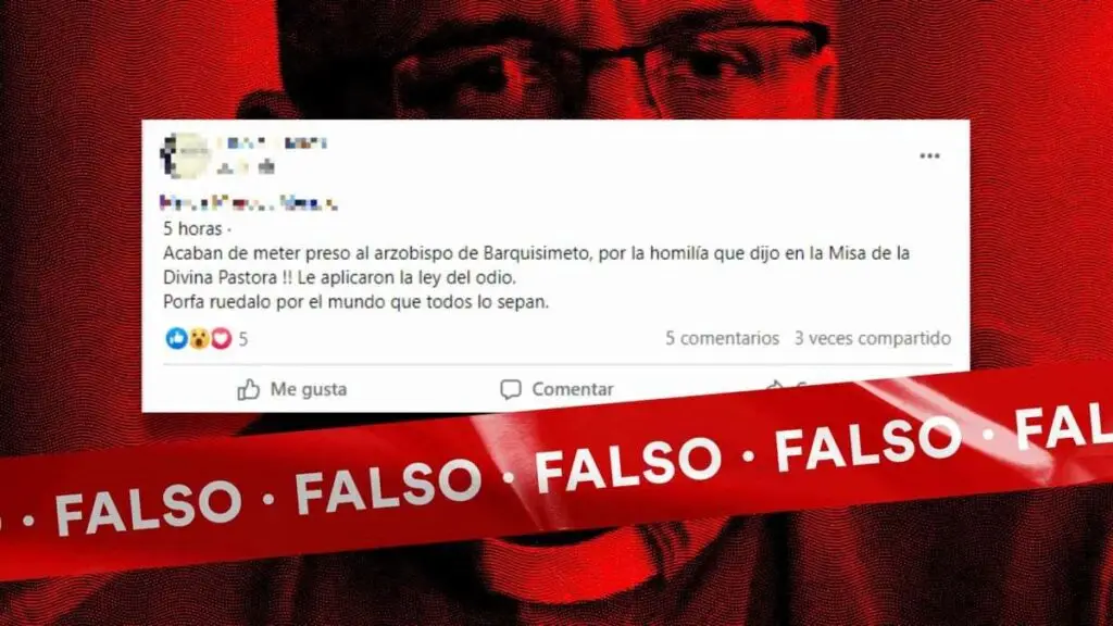 El mensaje que circula en Facebook y Twitter indica: “Acaban de meter preso al arzobispo de Barquisimeto, por la homilía que dijo en la Misa de la Divina Pastora !! Le aplicaron la ley del odio. Porfa ruedalo por el mundo que todos lo sepan (sic)”.
