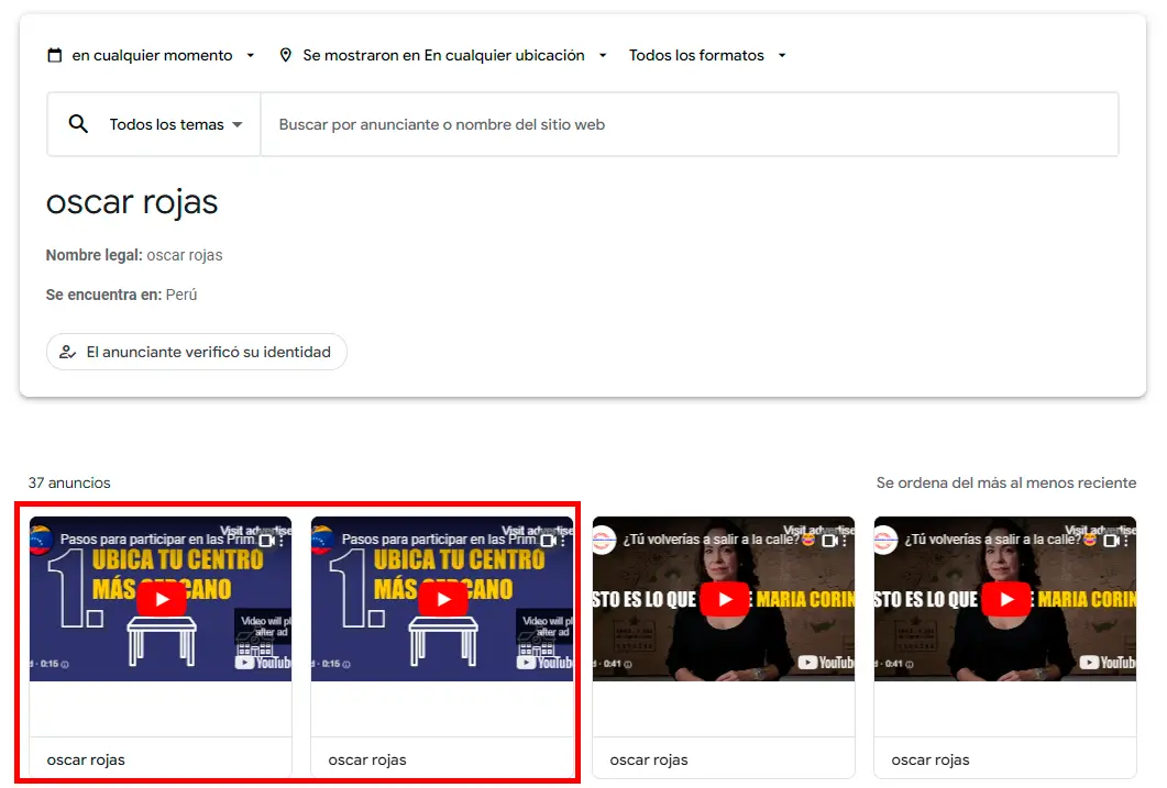 Todos los canales de la operación de influencia “YouTubeGanda” comparten a la misma persona como responsable del pago de estos anuncios: Oscar Rojas, radicado en Perú.