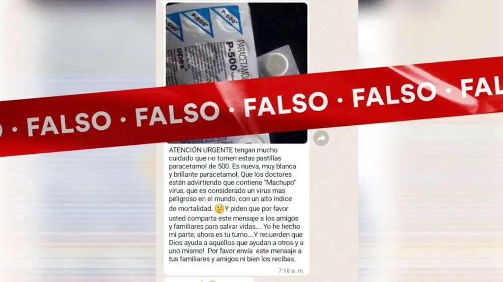 En los chats de WhatsApp ha vuelto a circular un mensaje de alerta y una fotografía que advierten sobre el consumo de pastillas de paracetamol P-500 contaminado de machupo, un virus peligroso que podría causar hasta la muerte.
